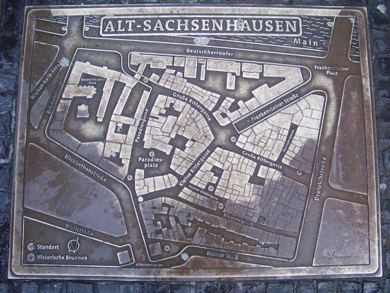 Die erste urkundliche Erwähnung Sachsenhausens im Jahr 1193 bezieht sich auf die Deutschordens-Kommende an der Alten Brücke. In unmittelbarer Nachbarschaft zum Deutschorden gab es Ritterhöfe, die ab 1194 nachgewiesen sind. Alt-Sachsenhausen umfasste vor der Zerstörung im Zweiten Weltkrieg das Gebiet zwischen Schulstraße, Wallstraße, Neuem Wall und Wasserweg. Die kleinteilige Architektur, wie man sie heute in dem Quartier der Rittergassen und der Klappergasse findet, gab es bis 1945 auch in der Elisabethenstraße und in dem Gebiet um die Dreikönigskirche mit der Löhergasse, Bäckergasse und Schellgasse sowie der Färber- und der Dreikönigsstraße.