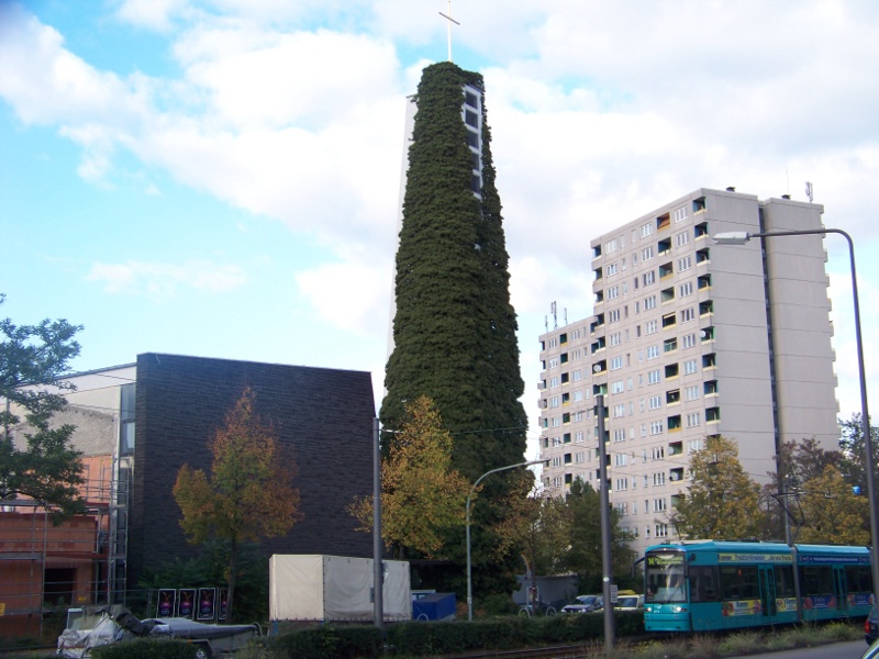 Zur gleichen Zeit wurde gegenüber auf dem Gelände des alten Riedhofes, für die neue evangelische Oster-Gemeinde eine Kirche mit dem heute fast völlig von Efeu überwucherten Kirchturm und einem Kindergarten gebaut.