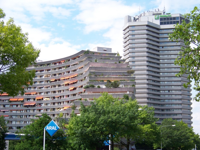 Im weiteren Verlauf unseres Spaziergangs treffen wir — nun wieder bergab und damit stadteinwärts — an der Darmstädter Landstraße auf große Wohneigentums-Anlagen, den sogenannten „Sonnenhügel", das Hotel „Holiday Inn" und den „Sonnenring", die zu Beginn der siebziger Jahre gegenüber dem Südfriedhof errichtet wurden. Der besondere Reiz dieser Anlagen liegt weniger in der architektonischen Qualität als vielmehr im grandiosen Blick von dort hinunter auf Frankfurt.